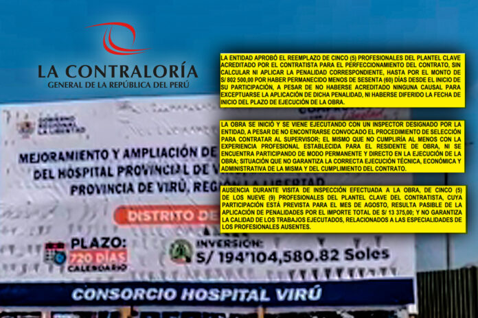 La Contraloría General de la República (CGR), a través de su Informe de Hito de Control N°067-2025-OCI/5342-SCC, con fecha 29 de agosto, identificó seis observaciones en la ejecución de la millonaria obra de mejoramiento y ampliación del Hospital de Virú, a cargo del Consorcio Hospital Viru, integrado por las empresas LC & EC Constructora Consultora, JM Constructores Peruanos, y Riva.