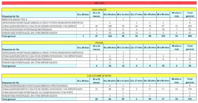 Según se detalla, hasta el mes de julio del 2025, existen 402 casos de enfermedades intestinales por consumo de agua no potable. De acuerdo a lo reportado, en el centro de salud de Casa Grande figuran 300 atenciones, en Roma 70 y Mocán 32.