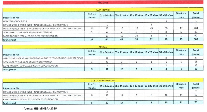 “Dicha información es emitida con fuentes confiables de HIS MINSA, у compartida para fines técnicos y sustento para las mejoras de las tantas causales de dichas patologías, las cuales tienen que ver con el consumo de agua no potable en el distrito de casa grande”, se lee en el documento.