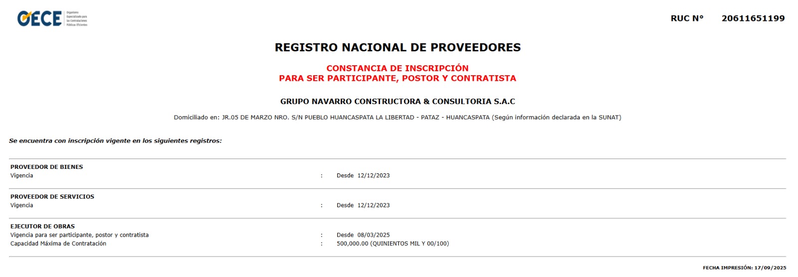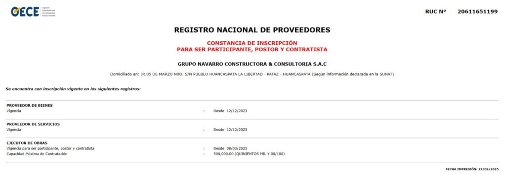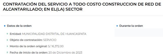 Según la documentación revisada por este medio de comunicación digital, Grupo Navarro Constructora & Consultoría obtuvo su Registro Nacional de Proveedores (RNP) de bienes y servicios el 12 de diciembre de 2023, y a la siguiente semana, el 20 de diciembre, se adjudicó una orden de servicio con la comuna de Huancaspata, por el servicio a todo costo de construcción de red de alcantarillado, por un monto de S/ 16,372.