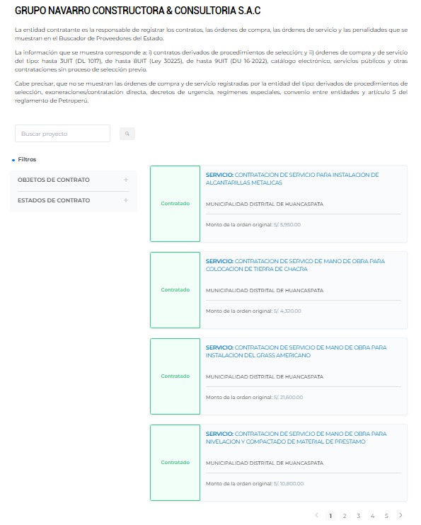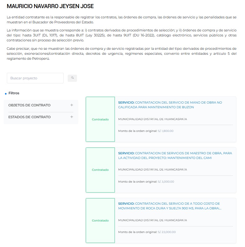 Macronorte.pe corroboró, a través de los archivos del Organismo Especializado para las Contrataciones Públicas Eficientes (OECE), que el Grupo Navarro Constructora & Consultoría SAC viene contratando exclusivamente con la Municipalidad Distrital de Huancaspata, liderada por el alcalde Gualberto Carrera Flores.