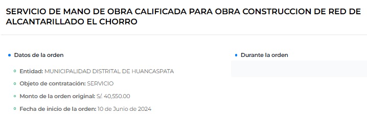 También figura el “Servicio de mano de obra calificada para obra construcción de red de alcantarillado El Chorro”. Esta orden fue emitida el 10 de junio de 2024, por un valor de más de 40 mil soles.