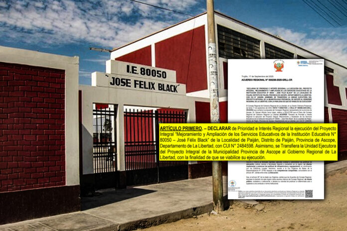 “Declarar de prioridad e interés regional la ejecución del Proyecto Integral “Mejoramiento y Ampliación de los Servicios Educativos de la Institución Educativa N° 80050 – José Félix Black” de la Localidad de Paiján, Distrito de Paiján, Provincia de Ascope, Departamento de La Libertad, con CUI N° 2484598”, señala el Acuerdo Regional N° 238-2025-CRLL-CR.
