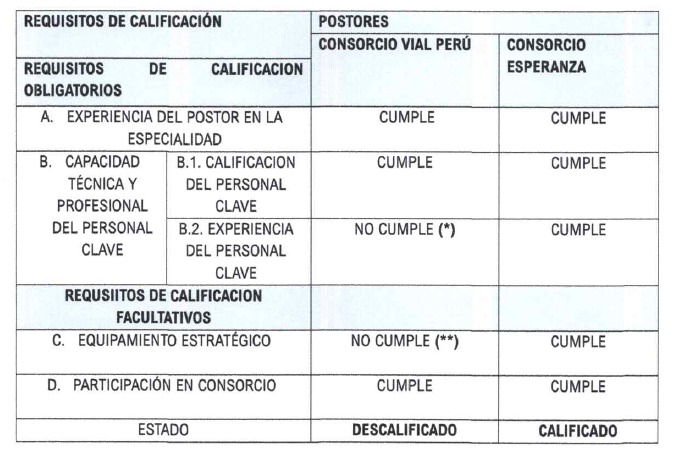 De acuerdo al acta de otorgamiento de buena pro, solo dos postores presentaron sus ofertas: Consorcio Esperanza y Consorcio Vial Perú, sin embargo, este último fue descalificado debido a que, según el comité de selección, no cumplió con los requisitos de experiencia del personal clave y el equipamiento estratégico.