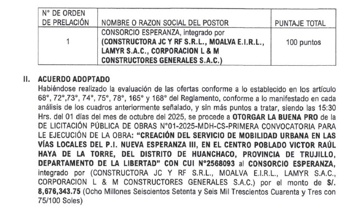 La Municipalidad Distrital de Huanchaco, liderada por el alcalde Efraín Bueno Alva, adjudicó la buena pro de la obra “Servicio de movilidad urbana en las vías locales del P.I. Nueva Esperanza III, en el centro poblado Víctor Raúl Haya de la Torre”, al Consorcio Esperanza, integrado por las empresas Constructora JC y RF S.R.L, Moalva E.I.R.L, Lamyr S.A.C. y Corporación L & M Constructores Generales S.A.C., por un valor de / 8,676,343.75.
