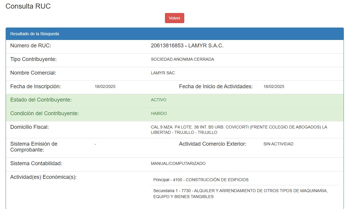 Lamyr S.A.C. también figura entre las empresas que integran el citado consorcio. Sobre esta empresa, se corroboró a través de la SUNAT, que fue creada en febrero de 2025, sin embargo, hasta el momento no registra contrato alguno con una entidad del Estado.