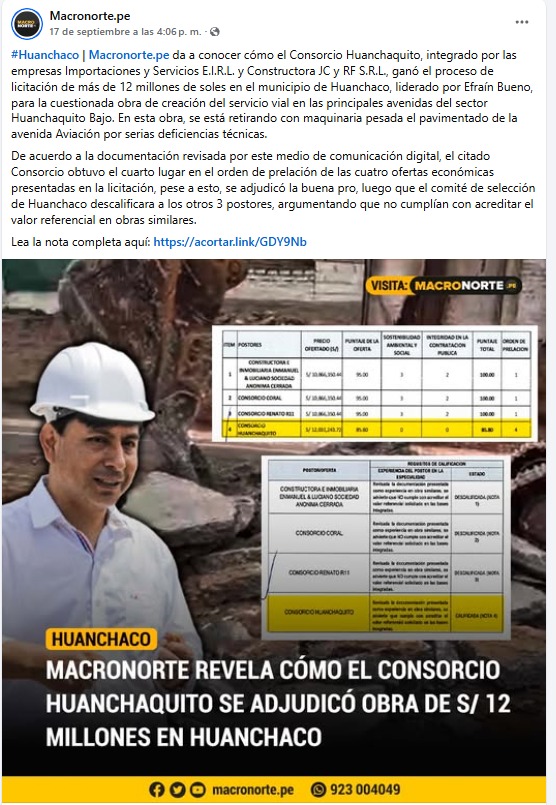 Sobre los integrantes del consorcio ganador de esta millonaria licitación, Macronorte ha identificado que no es la primera vez que Constructora JC y RF S.R.L. logró obtener un contrato con la gestión de Bueno Alva.