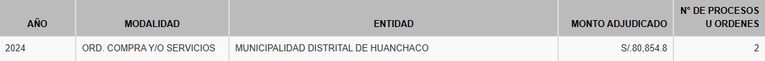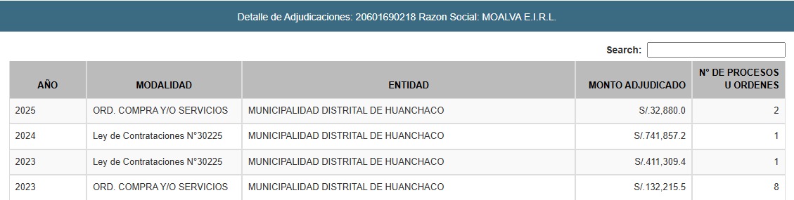 Otra de las empresas del Consorcio Esperanza es Moalva E.I.R.L., quien de acuerdo a los registros del Organismo Especializado para las Contrataciones Públicas Eficientes (OECE), tiene 7 ordenes de servicios, 1 orden de compra y 2 contratos de obra con la Municipalidad de Huanchaco.