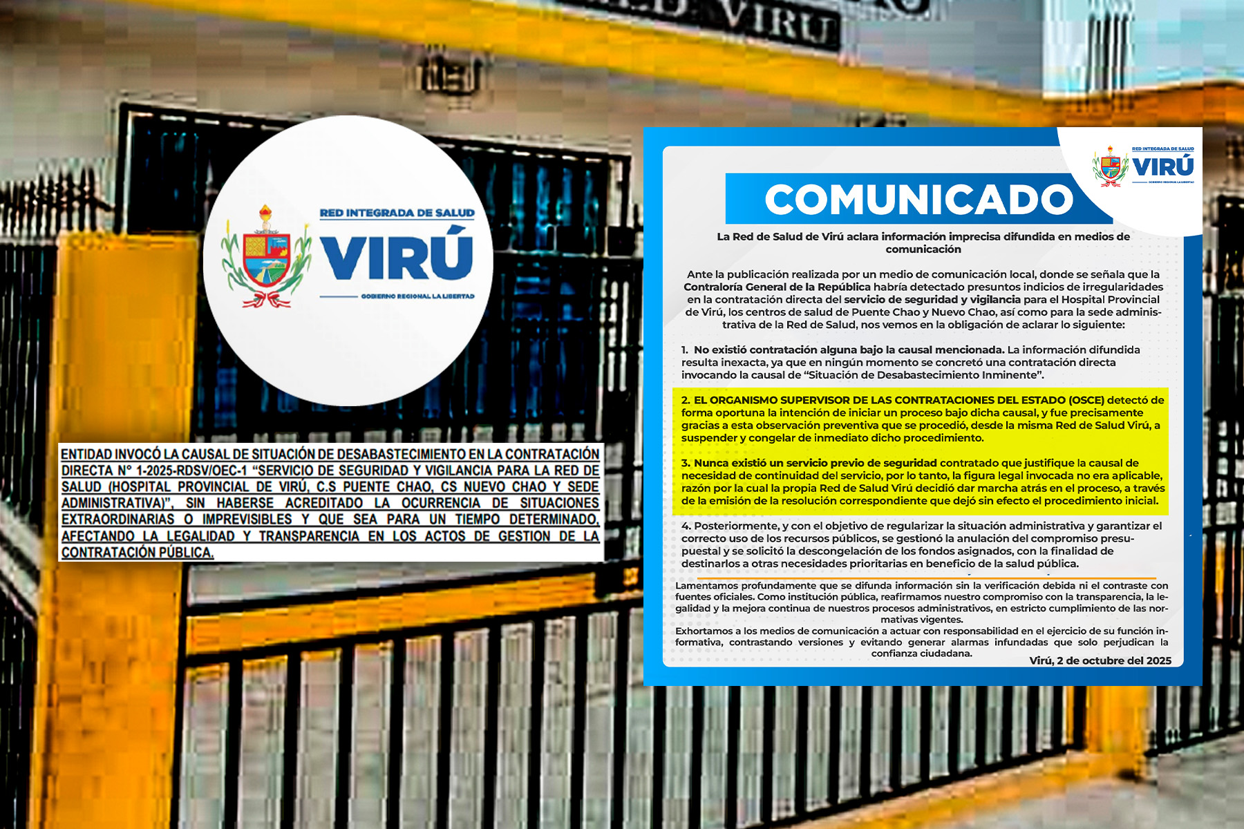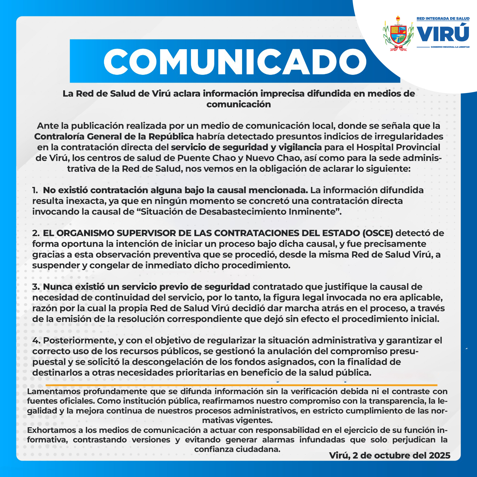A través de sus redes sociales, la Red de Salud Virú emitió un comunicado indicando que dicha información es inexacta porque en ningún momento se concretó una contratación directa invocando dicha causal.