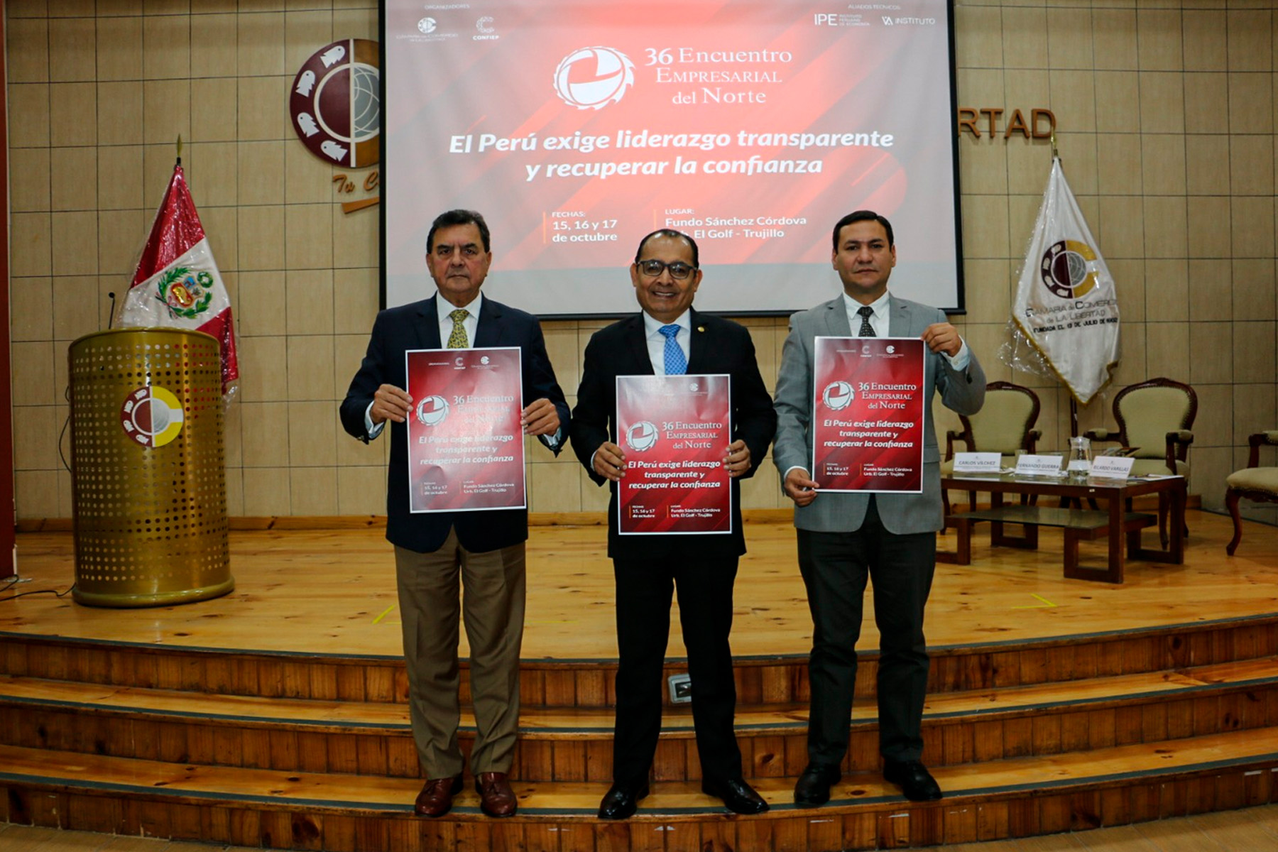 En conferencia de prensa, la Cámara de Comercio de La Libertad (CCLL) presentó nuevos alcances del 36° Encuentro Empresarial del Norte (EEN), que se realizará los días 15, 16 y 17 de octubre en el Fundo Sánchez Córdova, bajo el lema: “El Perú exige liderazgo transparente y recuperar la confianza”.