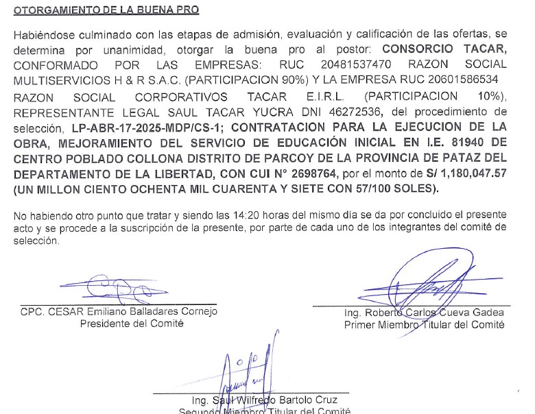 La Municipalidad Distrital de Parcoy, bajo la gestión del alcalde Alfredo Uriol, otorgó la buena pro de la obra “Mejoramiento del servicio de educación inicial en I.E. 81940 de centro poblado Collona distrito de Parcoy” al Consorcio Tacar, integrado por las empresas Multiservicios H & R S.A.C. y Corporativos Tacar EIRL, por un monto de S/ 1,180,047.57.