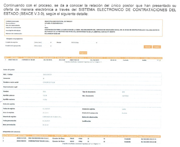 De acuerdo al acta de otorgamiento de buena pro, el mencionado Consorcio fue el único postor que presentó su oferta a través del SEACE, obteniendo una calificación de 100 puntos en los factores de evaluación a cargo del comité de selección integrado por César Balladares (presidente), Roberto Cueva (Miembro titular) y Saul Bartolo (Miembro titular).