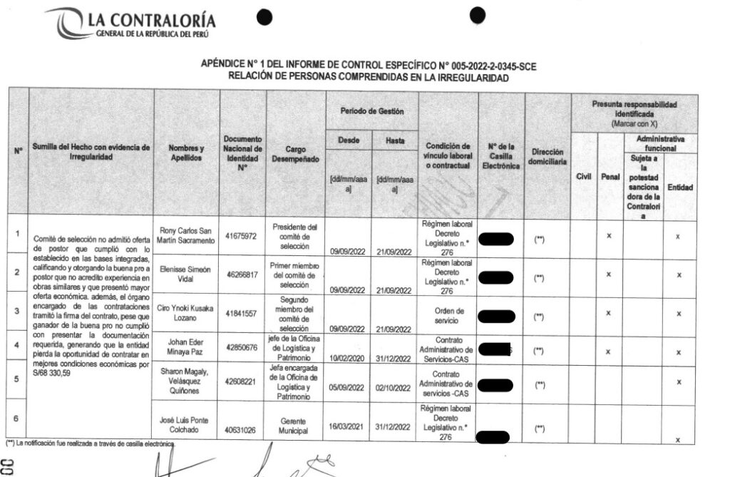 Otro de los informes de la Contraloría señala que José Ponte, como segundo miembro titular del comité de selección de Sihuas, decidió declarar como ganador de la buena pro a una empresa, que a su vez designó como inspector a una persona natural para dicha función; “resultando que el citado profesional no tenía un vínculo válido ni de subordinación con la Entidad”.