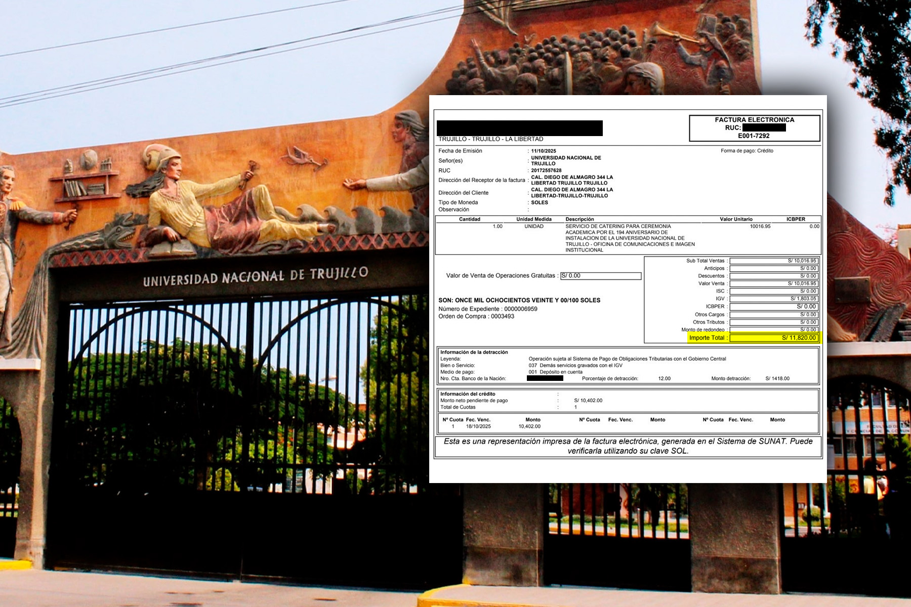 Esto se basa en la factura electrónica N°E001-7292, emitida el pasado 11 de octubre de 2025 por un servicio contratado por la Oficina de Comunicaciones e Imagen Institucional que incluyó S/ 10,016.95 como valor base, más S/ 1,803.05 de IGV, totalizando los S/ 11,820.
