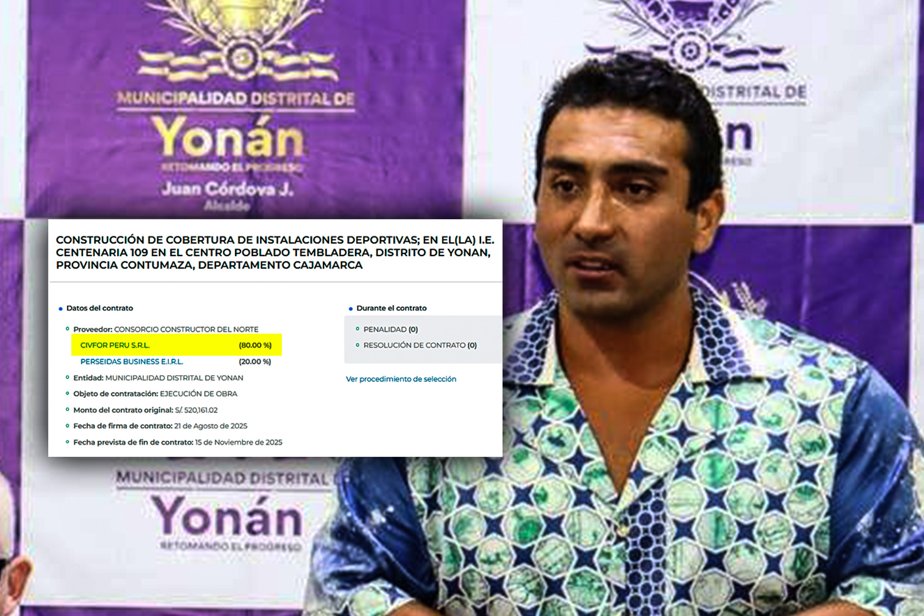 Durante la revisión el contrato entre el municipio de Yonan y el citado consorcio, se corroboró que la empresa CIVFOR Perú, pese a no contar con experiencia, tiene un porcentaje de participación del 80% en la obra, siendo además la encargada de la facturación; mientras la otra empresa solo cuenta con el 20% de participación.