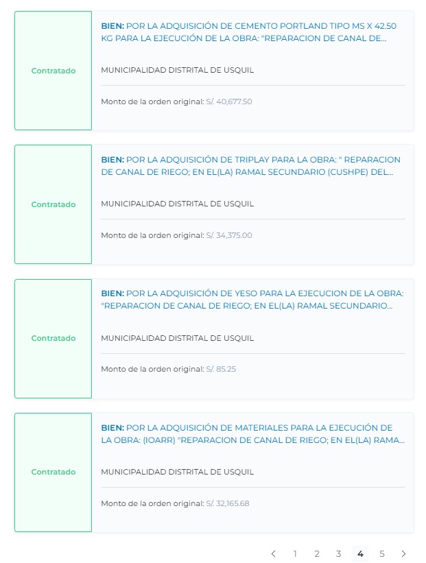 La Municipalidad Distrital de Usquil, liderada por el alcalde Guillermo Guzmán, otorgó la buena pro de la adquisición de materiales de construcción para la ejecución de la obra: «Creación de los servicios operativos o misionales institucionales en el palacio municipal del centro poblado Demonchacap, del distrito de Usquil” a la empresa Lizdelmar Contratistas Generales S.A.C, por un monto de S/ 47,551.20.
