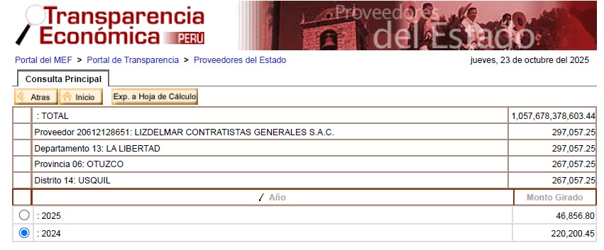 Según el portal de Transparencia Económica del Ministerio de Economía y Finanzas (MEF) durante los años 2024 y 2025, la Municipalidad Distrital de Usquil giró S/ 220,200.45 y S/ 46,856.80, respectivamente, a la empresa Lizdelmar.