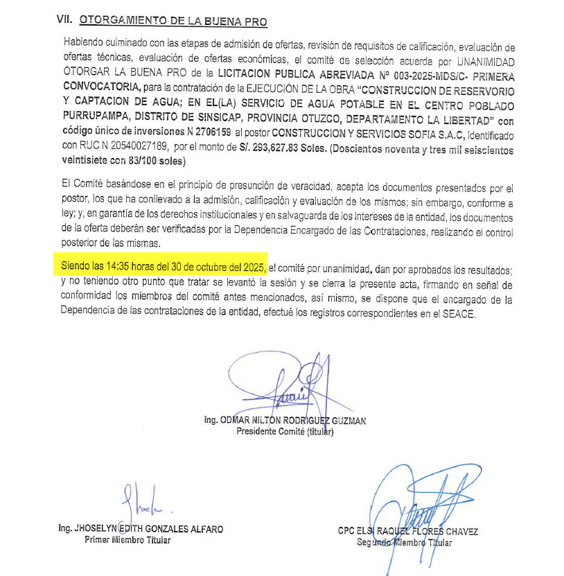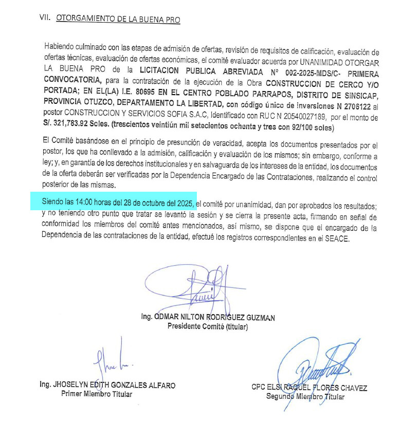 En esa línea, tras la evaluación de las ofertas económicas, se determinó el orden de prelación, obteniendo de esta manera Construcción y Servicios Sofía el primer lugar, y, en consecuencia, la buena pro del proceso.
