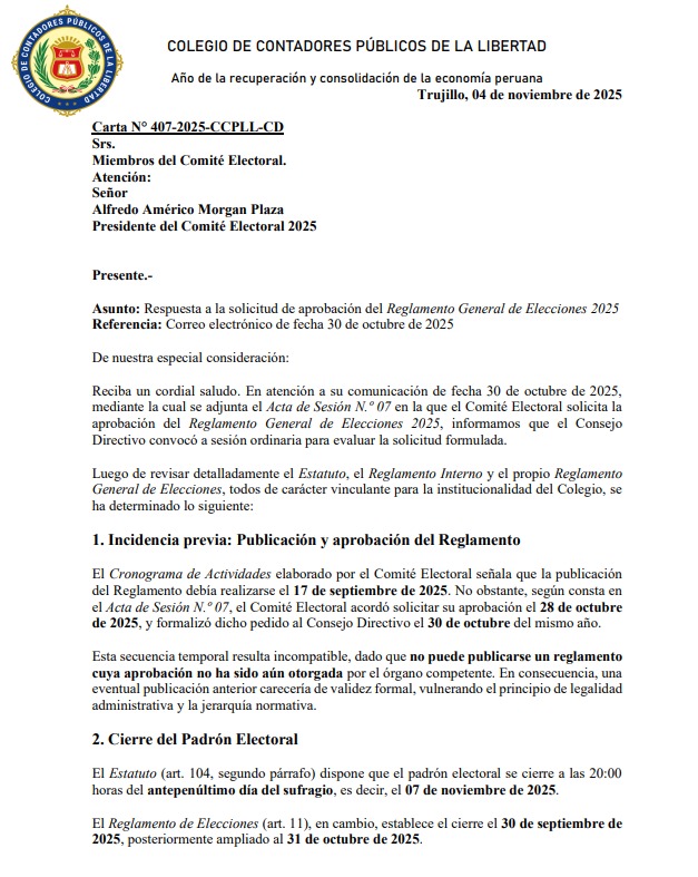 El pasado 30 de octubre de 2025, el Comité Electoral remitió al Consejo Directivo el Acta de Sesión N.º 07, en la que se solicita la aprobación del Reglamento General de Elecciones 2025. Sin embargo, mediante Carta N°407-2025-CCPLL-CD, la actual directiva determinó que el Reglamento General de Elecciones 2025 y su cronograma presentan diversas incongruencias con el Estatuto y el Reglamento Interno.