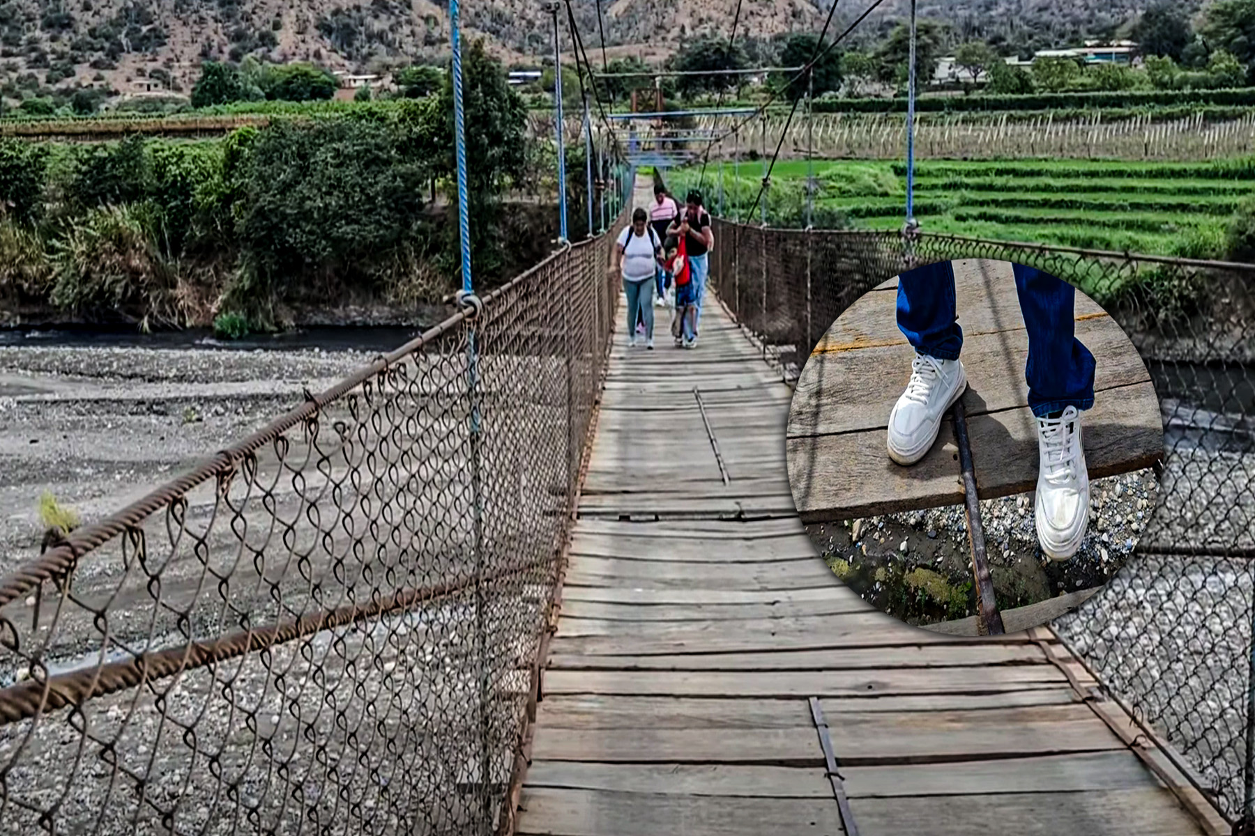 Peligro a la vista. Moradores del caserío Septén, del distrito de Marmot, provincia de Gran Chimú, diariamente ponen en riesgo sus vidas al cruzar por el puente colgante sobre el río Chicama.