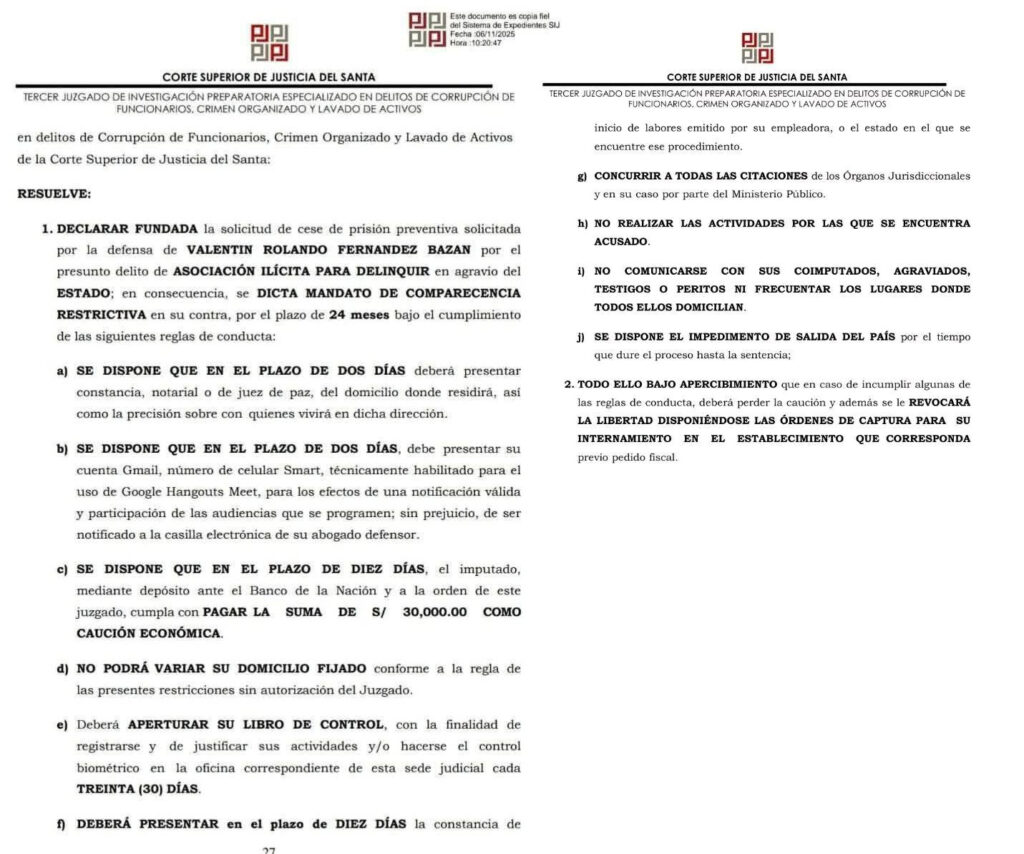 La resolución dispone que Fernández Bazán cumpla un mandato de comparecencia restrictiva por 24 meses, bajo reglas de conducta como no variar su domicilio sin autorización judicial, pagar una caución económica de 30 mil soles, y presentarse periódicamente al control biométrico ante el Poder Judicial.