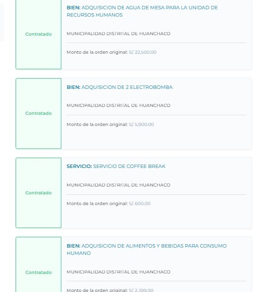Entre ellas destacan órdenes para la adquisición de agua de mesa, 2 electrobomba, servicio de coffee break, adquisición de alimentos y bebidas, empanadas de pollo y útiles de oficina.