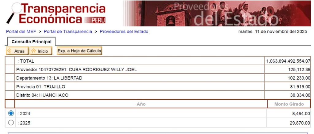De acuerdo al portal de Transparencia Económica del Ministerio de Economía y Finanzas (MEF), se verificó que la gestión de Efraín Bueno giró en el 2024 y 2025, montos de S/ 8,464 y S/ 29,870, respectivamente, a Willy Cuba.