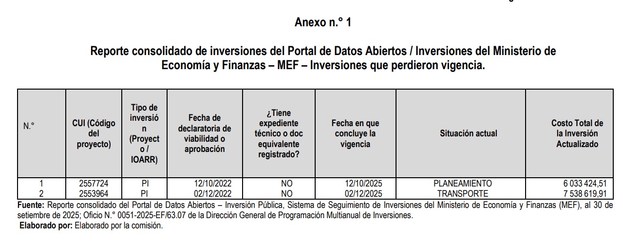 Al revisar el reporte consolidado de inversiones del Portal de Datos Abiertos del Ministerio de Economía y Finanza, se corroboró que uno de estos proyectos perdió su viabilidad el pasado 12 de octubre de 2025, mientras que el segundo perderá su vigencia el próximo 2 de diciembre del presente año.