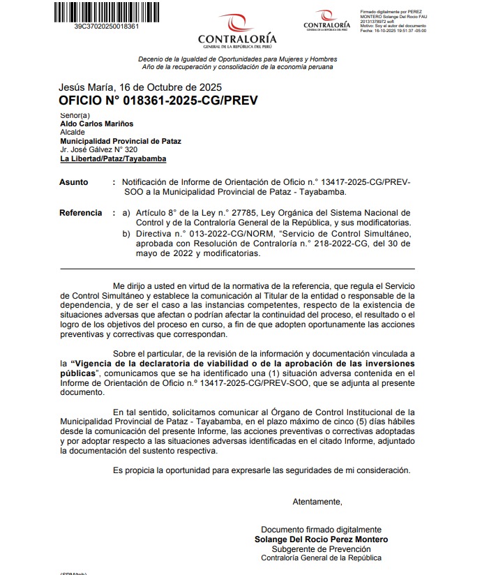 Esto fue puesto en conocimiento del alcalde Aldo Mariños con la finalidad que se adopten las acciones preventivas y correctivas que correspondan, en el marco de sus competencias y obligaciones en la gestión institucional.