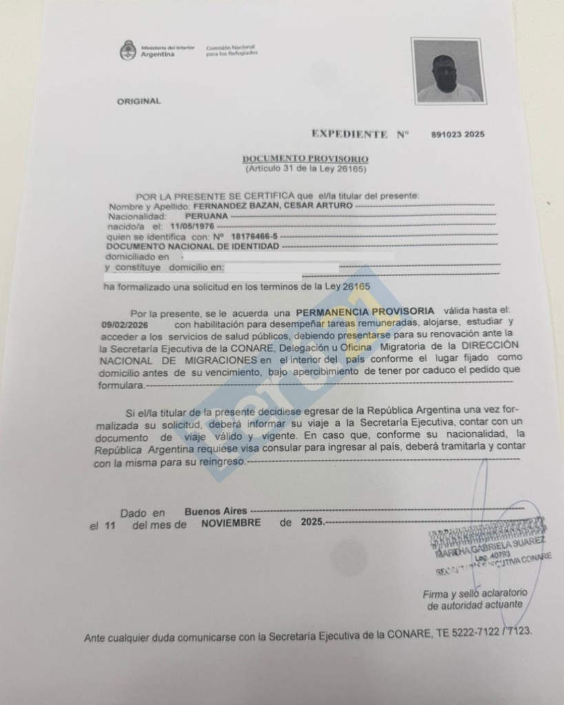 Perú21 accedió a un documento de fecha 11 de noviembre, el cual certifica que el prófugo de la justica logró que el gobierno argentino le otorgara la condición de “refugiado”.