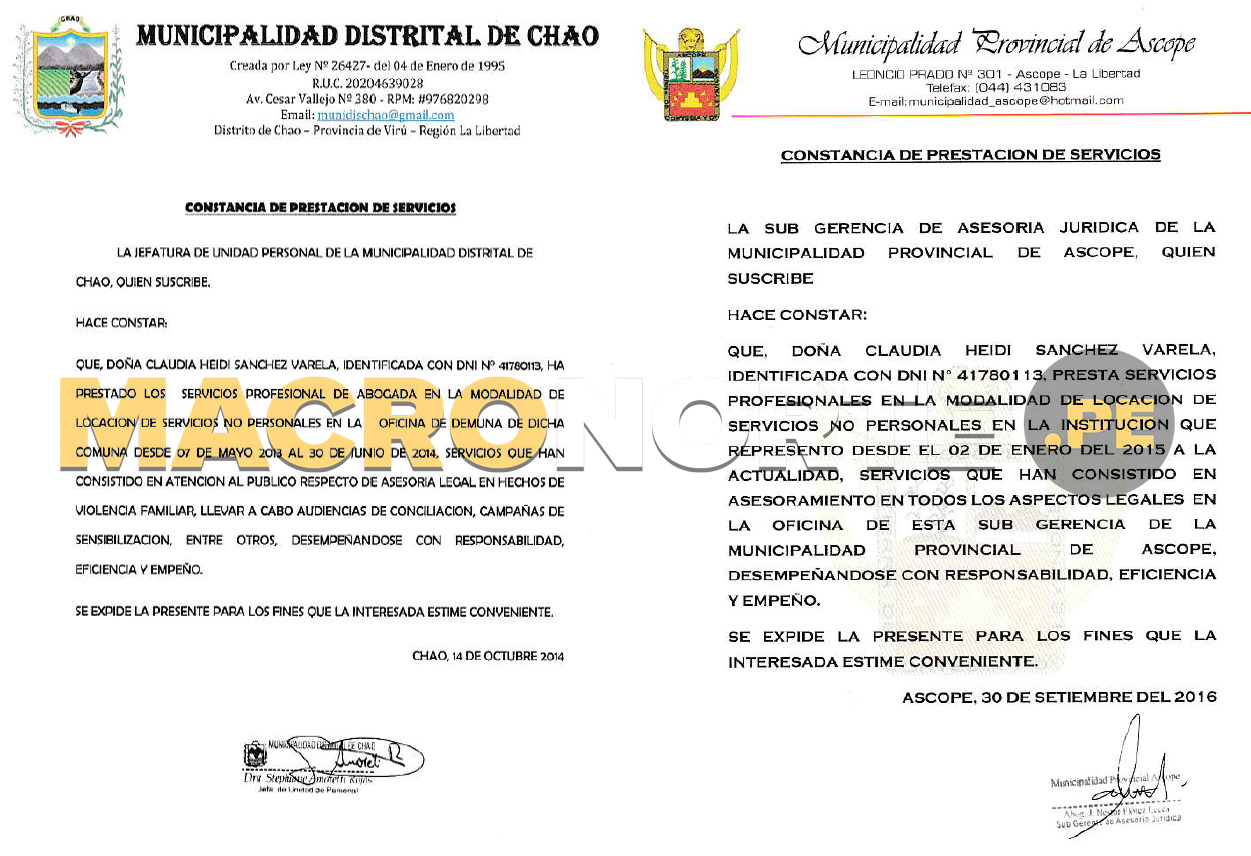 Los documentos en tela de juicio, de acuerdo al órgano de control, son dos constancias de trabajo que certifican que la persona en mención laboró en los municipios de Chao y Ascope.
