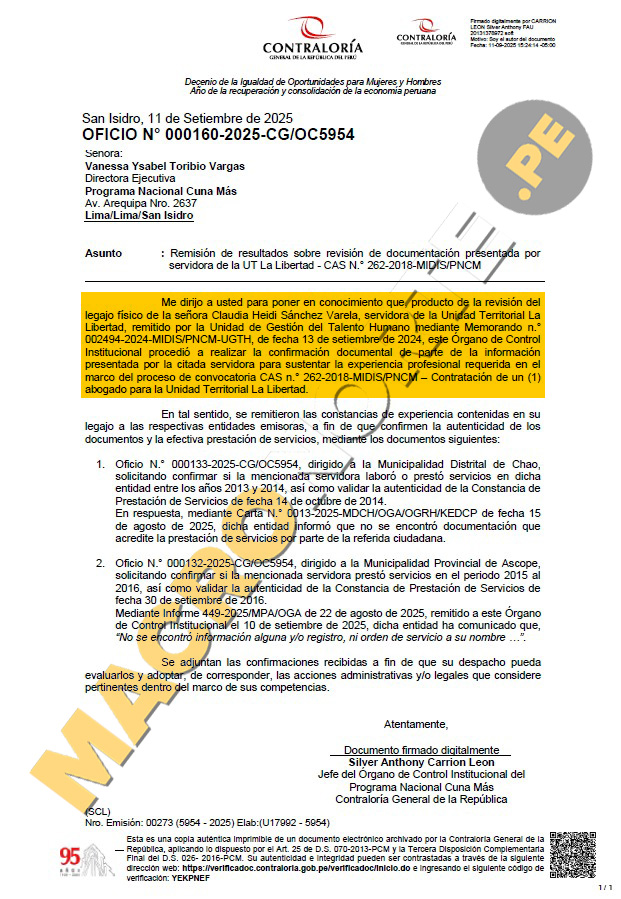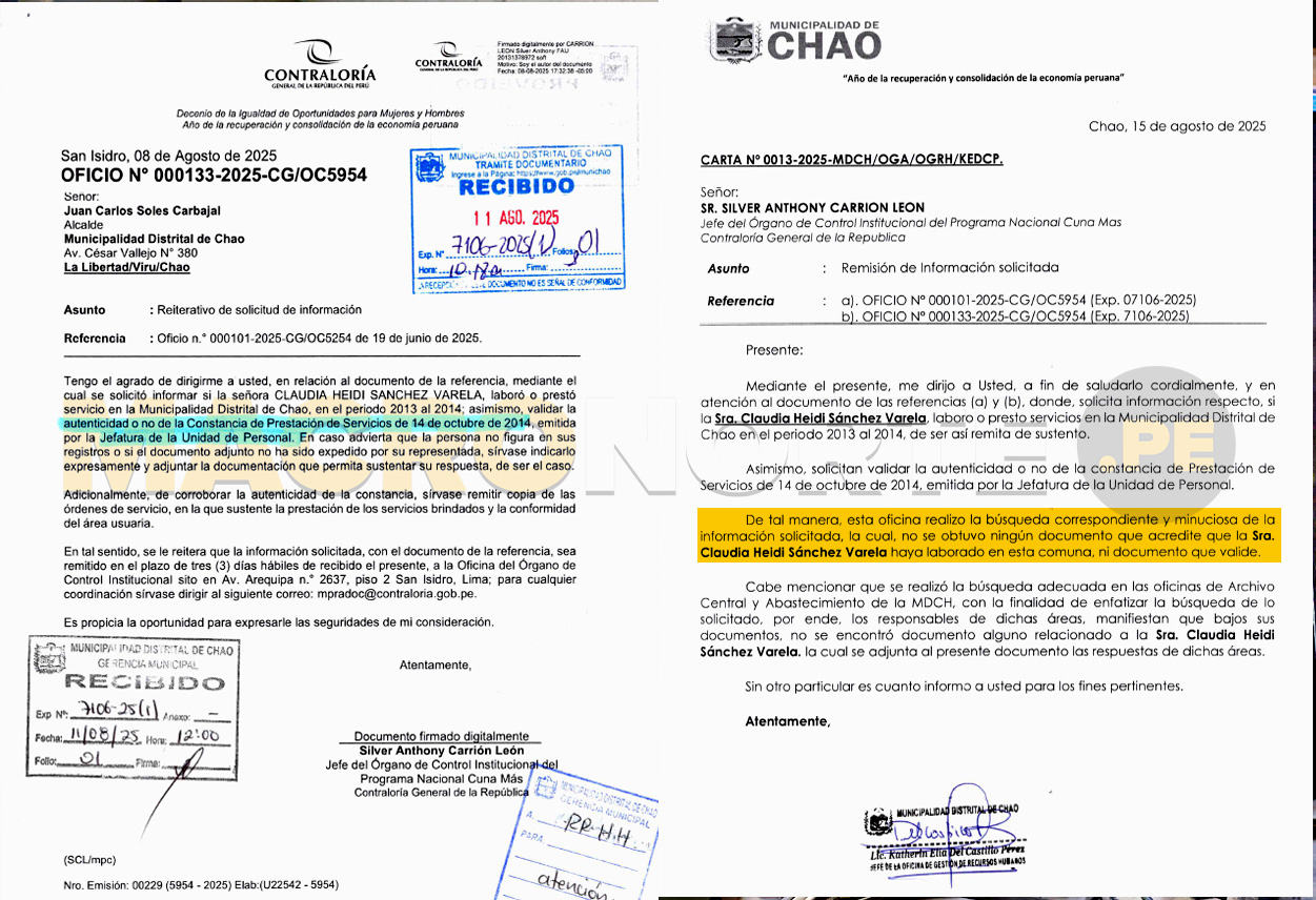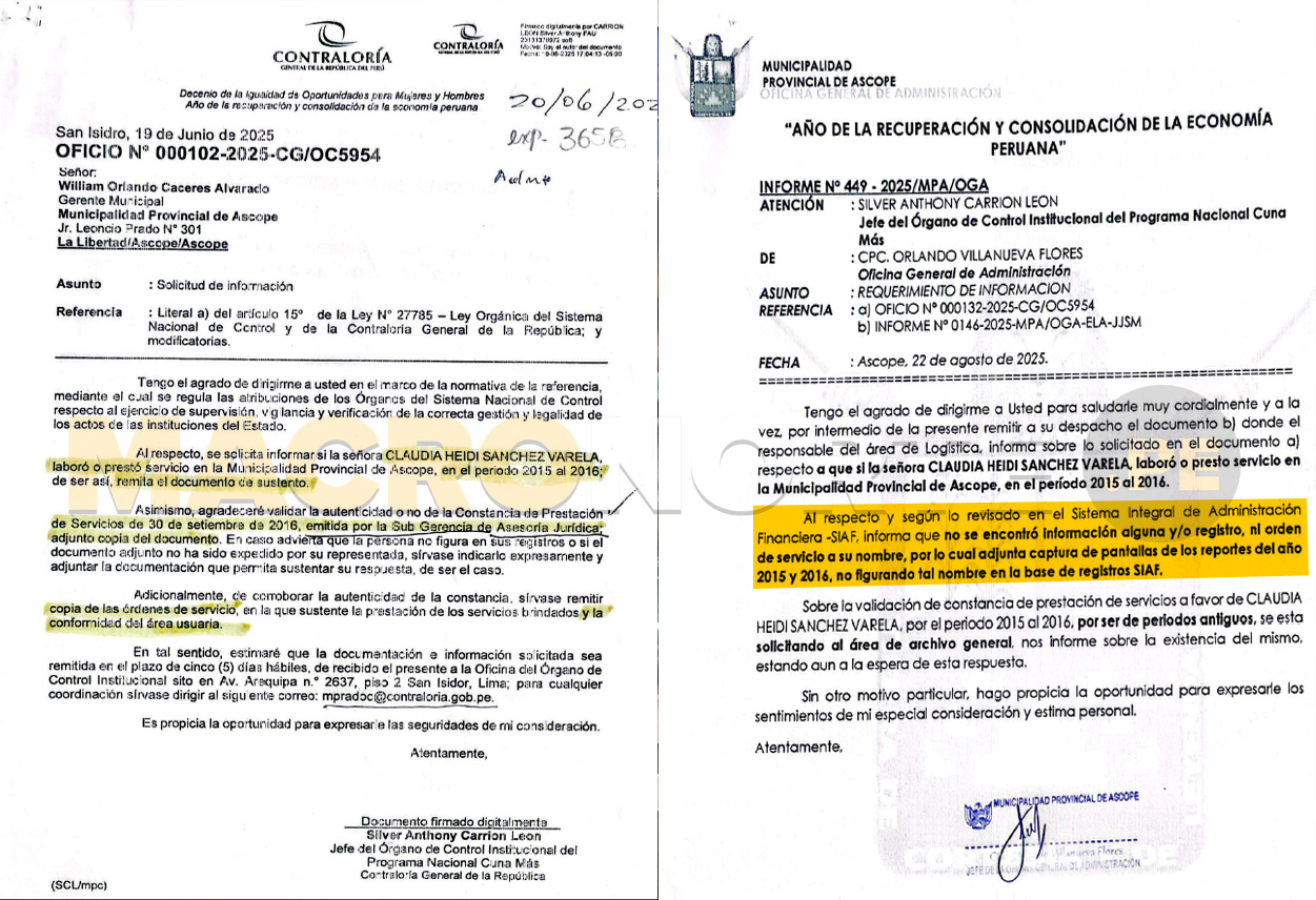 Asimismo, con Oficio N° 132-2025-CG/OC5954 dirigido a la Municipalidad Provincial de Ascope, la Contraloría solicitó se corrobore si Sánchez Valera prestó servicios en el periodo 2015 al 2016, así como validar la autenticidad de la Constancia de Prestación de Servicios de fecha 30 de setiembre de 2016.