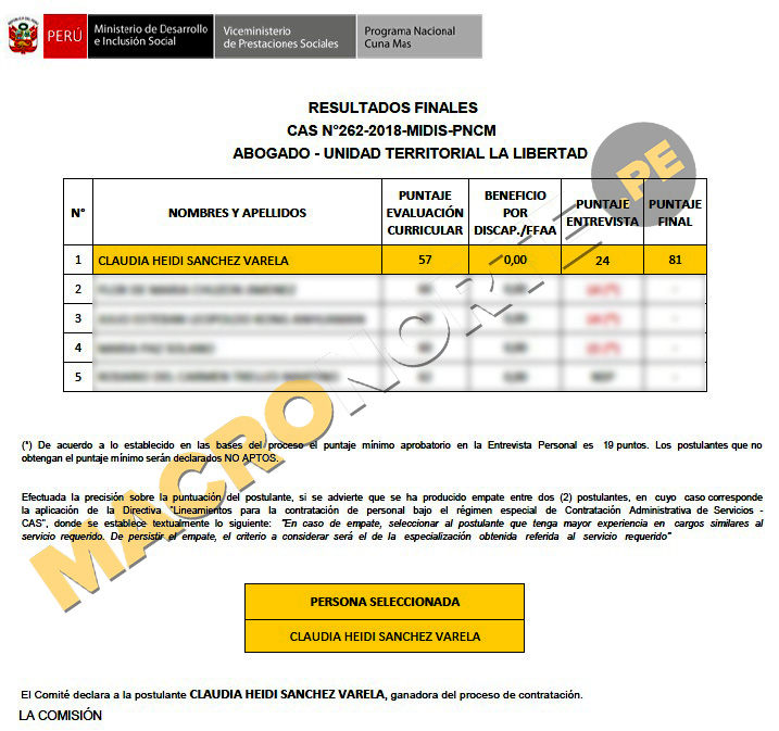 Sin embargo, la Contraloría General de la República (CGR) detectó que Sánchez Valera habría presentado documentación falsa durante el Proceso CAS N° 262-2018-MIDIS-PNMC, del cual resultó ganadora.