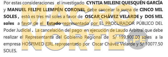 Además de las penas de prisión solicitadas, el requerimiento fiscal ordena que Quesquén García y Llempén Coronel paguen S/ 5 mil por concepto de reparación civil: S/ 3 mil a favor de Chávez Velarde y S/ 2 milpara el Estado, representado por el Procurador Público del Poder Judicial.
