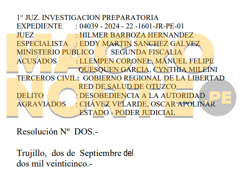 La Segunda Fiscalía Provincial Penal Corporativa de Trujillo solicitó prisión para Cyntia Mileini Quesquén García, por su actuación como Directora Ejecutiva de la Red de Salud de Otuzco, y a Manuel Felipe Llempén Coronel, por su actuación como Gobernador Regional de La Libertad, tras acusarlos como autores del delito contra la administración pública, en la modalidad de desobediencia a la autoridad, al no cumplir reiteradas órdenes judiciales.