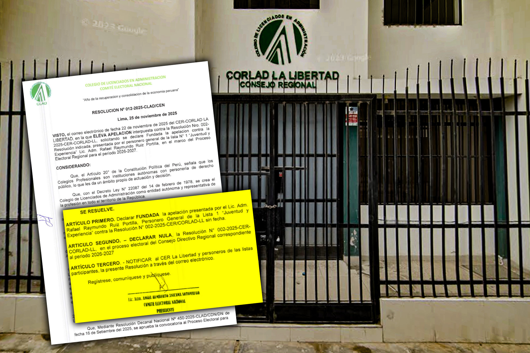 El Comité Electoral Nacional (CEN) del Colegio de Licenciados en Administración (CLAD) emitió la Resolución N° 012-2025-CLAD/CEN que declara fundada la apelación presentada por el personero de la Lista Nº 1: «Juventud y Experiencia» contra la Resolución N° 002-2025-CER-CORLAD La Libertad, dejando sin efecto la inscripción de la Lista Nº 2 en el proceso electoral regional para el período 2026-2027 debido a transgresiones al principio de imparcialidad y graves irregularidades normativas.