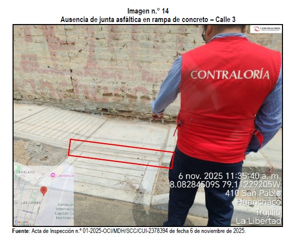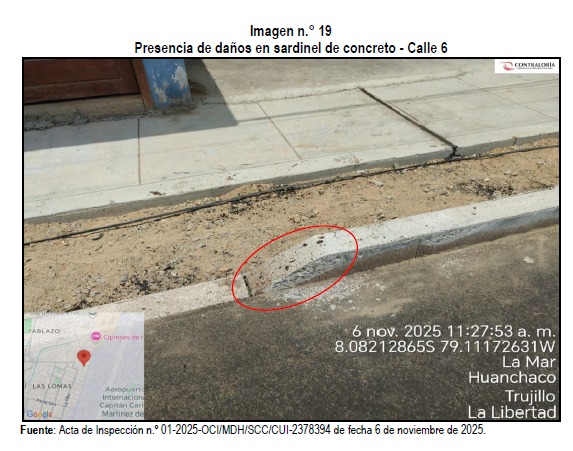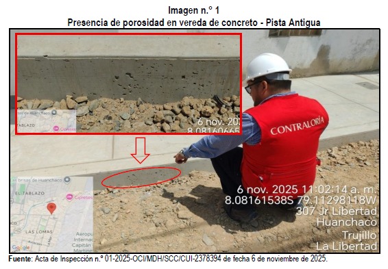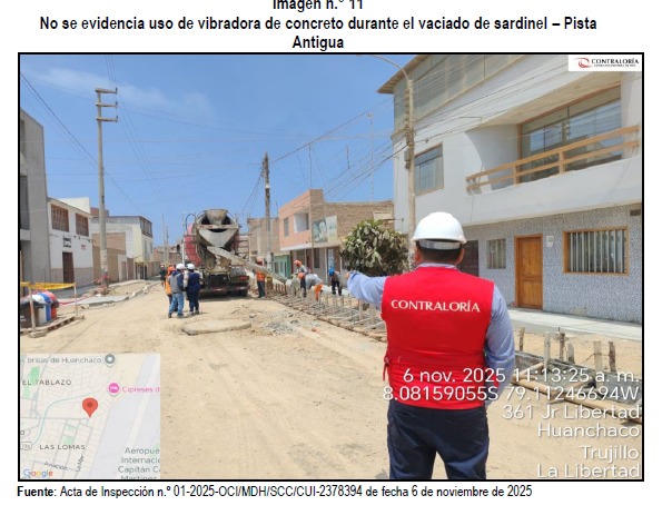 La Contraloría General de la República (CGR) identificó que la obra “Creación del servicio de transitabilidad vial en las calles del sector I del AA.HH. Las Lomas, distrito de Huanchaco”, a cargo del Consorcio Vial OTG, integrado por Corporación Otinga S.A.C. y Julio Giancarlo Otiniano Plasencia, presenta deficiencias de calidad en vereda, sardineles y rampas de concreto.