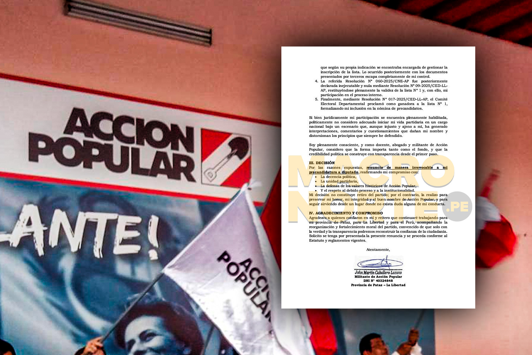 Macronorte.pe accedió a la carta de renuncia de John Caballero Lozano a la precandidatura a la Cámara de Diputados en la lista de la lista liderada por César Salinas, por el partido Acción Popular, con miras a las elecciones 2026.