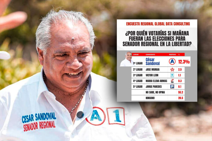 El candidato de Alianza para el Progreso, con el número 1, César Sandoval, encabeza la intención de voto para el Senado en La Libertad con 12.3%, de acuerdo con una encuesta regional difundida como aviso contratado por el diario La República.