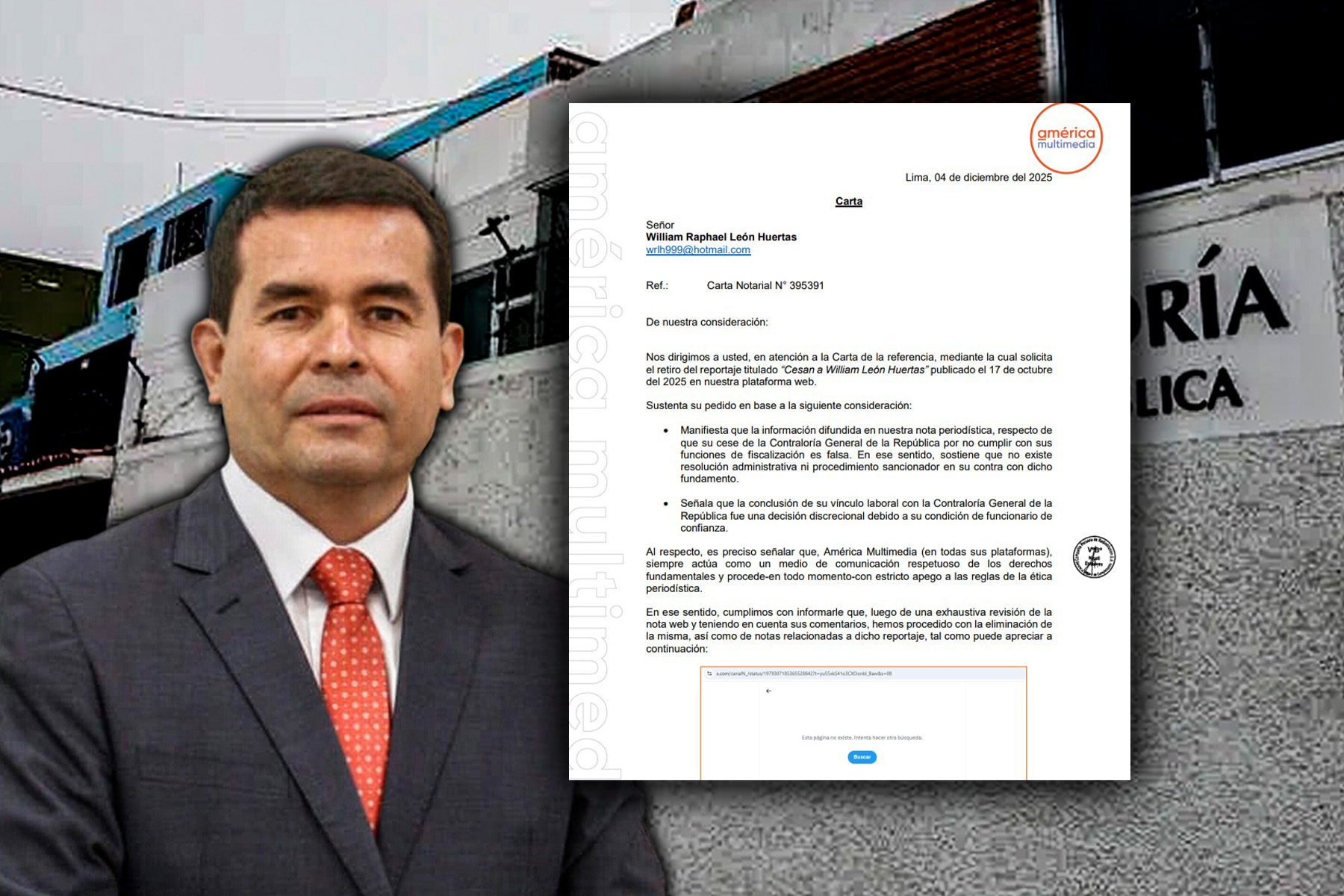 El exjefe de la Contraloría General de la República en la región La Libertad, William León Huertas, envió hace algunos meses una carta notarial a Canal N solicitando el retiro del reportaje titulado “Cesan a William León Huertas”, publicado el 17 de octubre de 2025 en la plataforma web del medio.