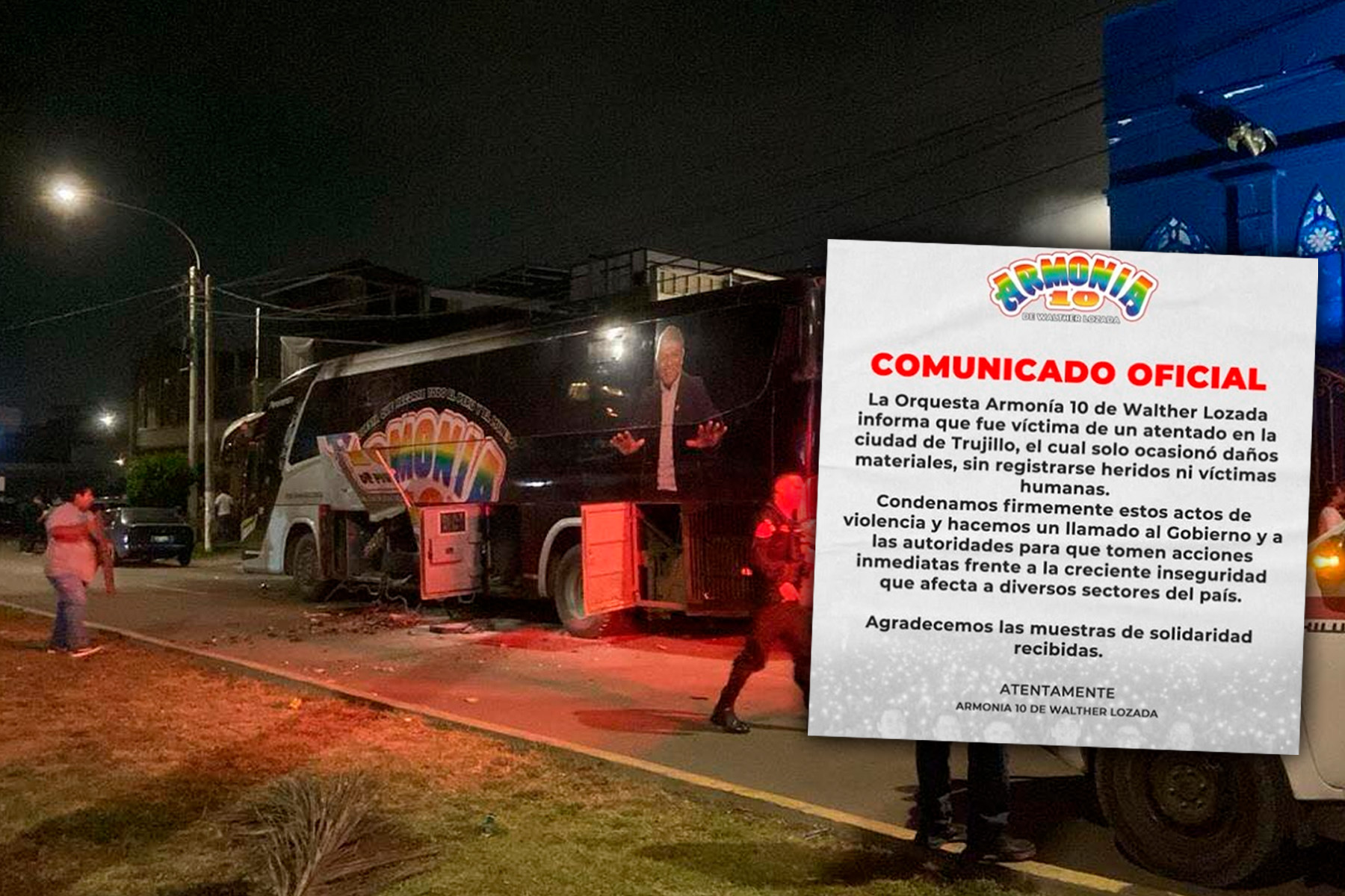 “La Orquesta Armonía 10 de Walter Lozada informa que fue víctima de un atentado en la ciudad de Trujillo, el cual solo ocasionó daños materiales, sin registrarse heridos ni víctimas humanas”, expresaron.
