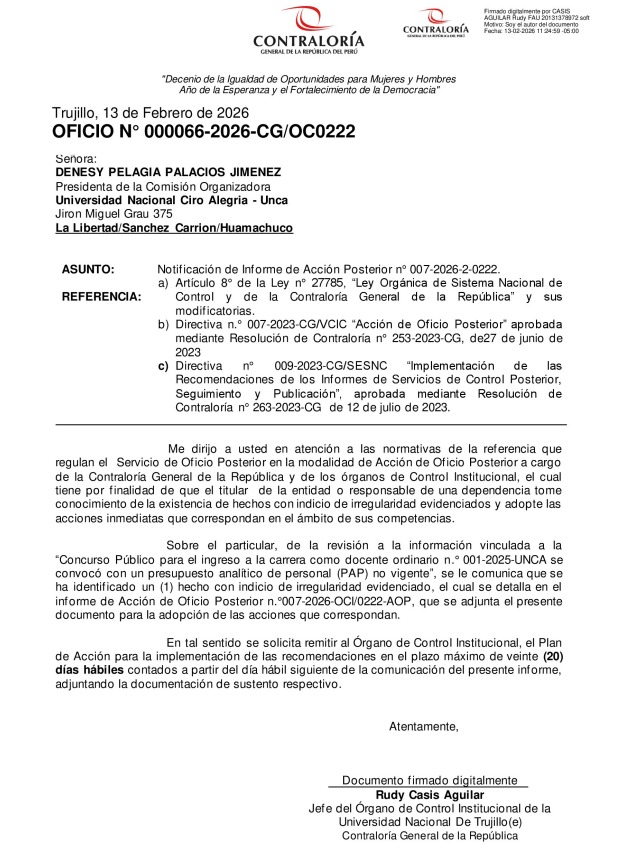 Esto fue comunicado a la presidenta de la Comisión Organizadora de la UNCA para que adopte las acciones que correspondan en el ámbito de sus competencias y disponga el deslinde de responsabilidades que correspondan.