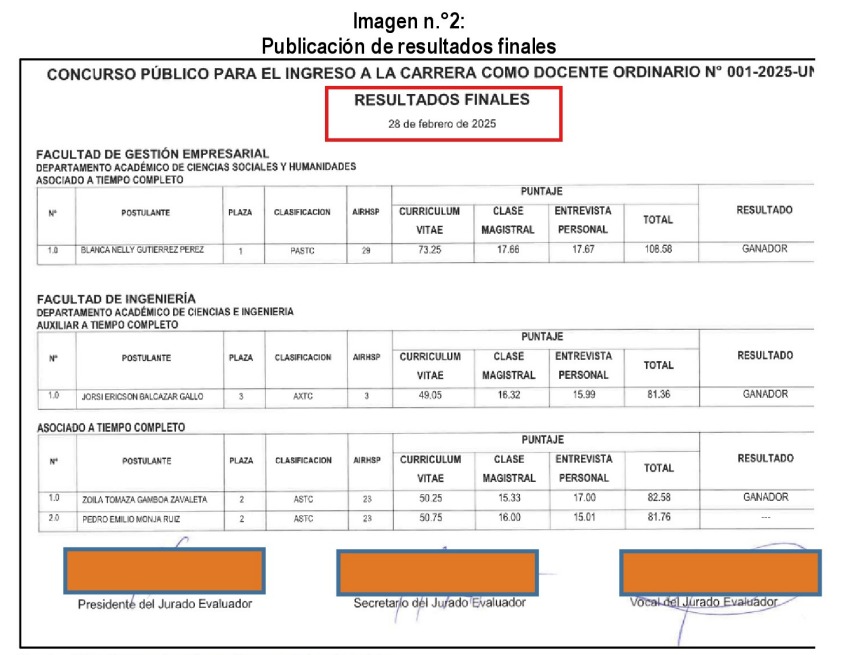 “Siendo que, además, la formalización del PAP 2025 se concretó mediante la Resolución de Presidencia N°057-2025-UNCA-P de 9 de setiembre de 2025, es decir siete meses después de la selección de los docentes”, agregan.