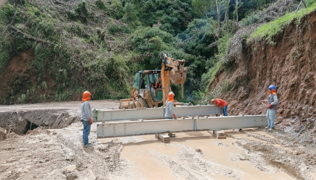 • Instalación de un puente modular provisional, que permitirá restablecer el tránsito vehicular de manera segura.