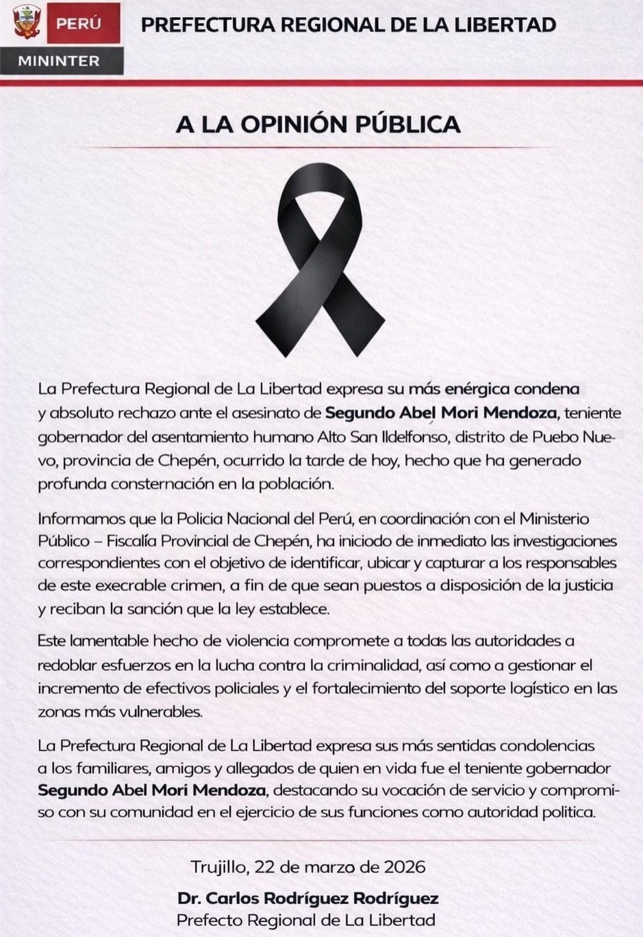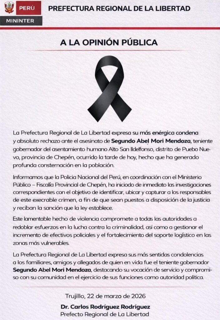 El teniente gobernador Segundo Abel Mori Mendoza fue hallado sin vida tras un ataque delincuencial en la provincia de Chepén, región La Libertad.
