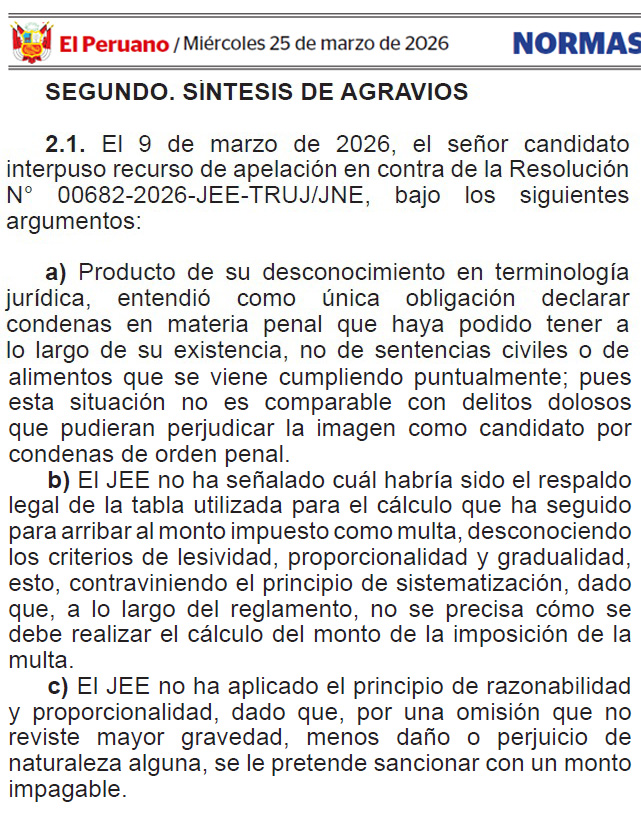 Burneo Carrasco presentó el reciente 09 de marzo una apelación contra la resolución que lo sancionó al pago de S/ 24,062.50 (4.375 UIT). Uno de sus argumentos fue que entendió como única obligación declarar condenas en materia penal y no sentencias civiles o de alimentos.