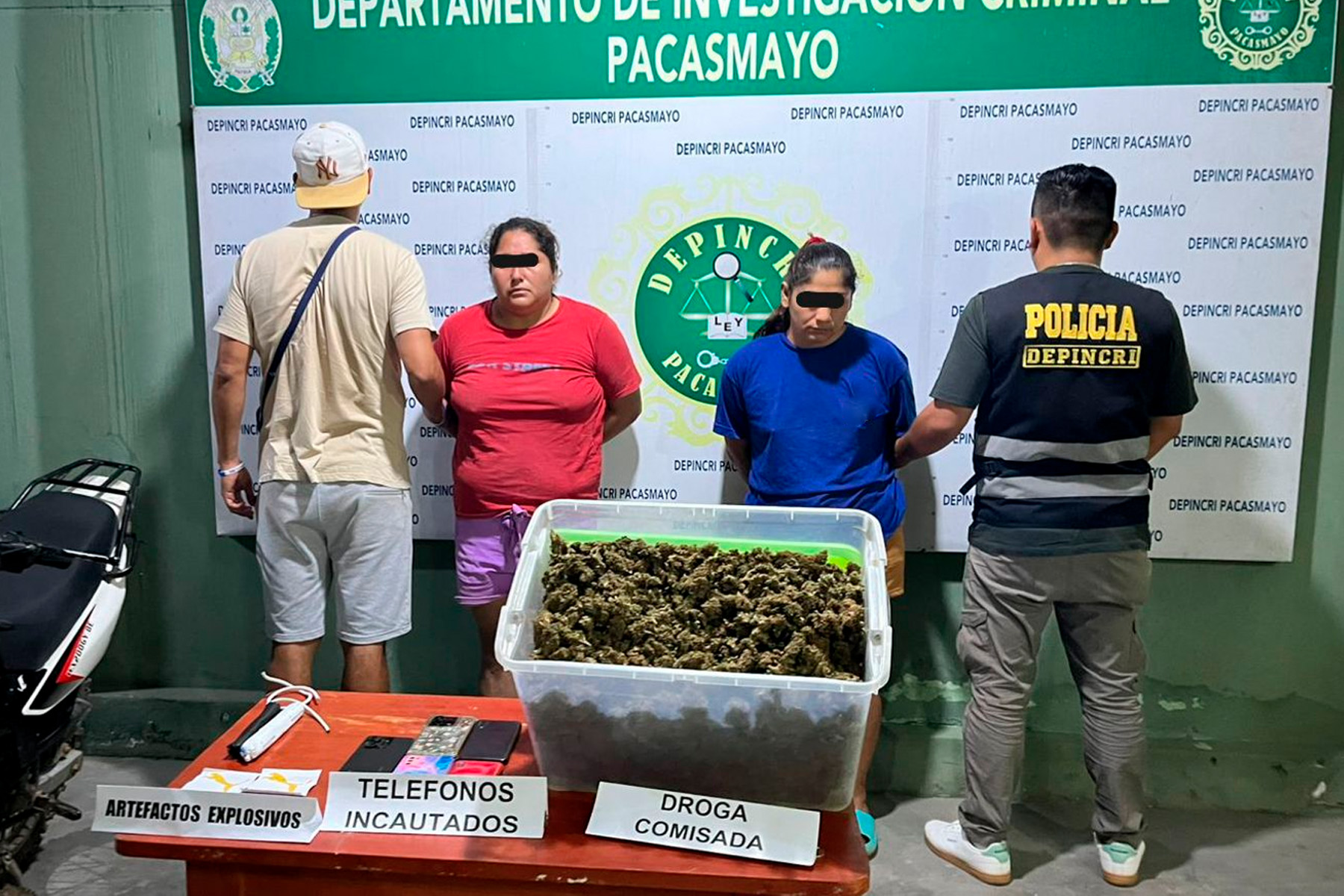 Durante la persecución, se incautó una caja con marihuana (Cannabis Sativa) en hojas, tallos y semillas secas, además de dos artefactos explosivos improvisados listos para ser utilizados, cinco celulares y una motocicleta sin placa de rodaje y objetos vinculados a la actividad ilícita.