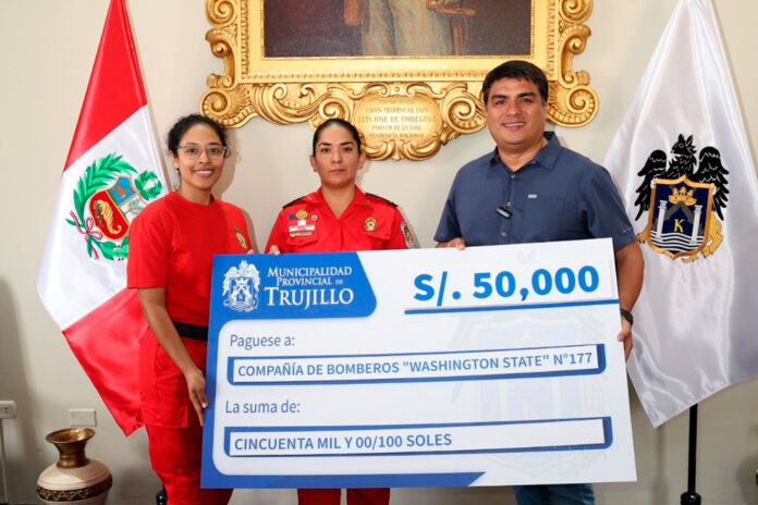 El alcalde provincial Mario Reyna Rodríguez entregó a nombre de la comuna y de la población de Trujillo, un cheque con una subvención de S/ 50 mil a la Compañía de Bomberos “Washington State N° 177”, con sede en la urbanización La Rinconada.
