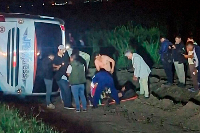 Pasajeros y conductores ayudaron a las personas lesionadas a salir de la unidad que quedó a un costado de la vía, junto a cultivos de caña de azúcar.